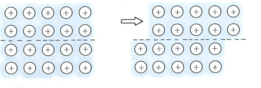 Figura 2 – Scorrimento di un piano cristallino in cui si evidenzia l’effetto tampone esercitato dalla nube elettronica che si frappone tra le cariche positive.